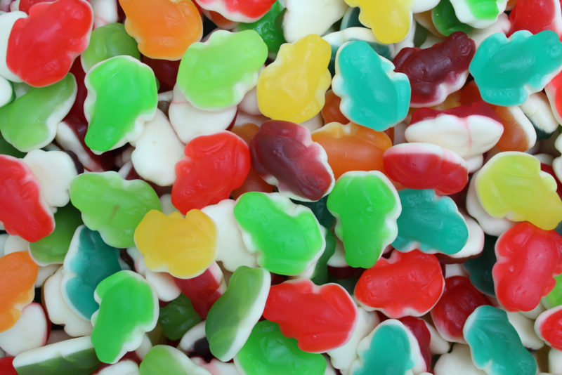 Glucosestroop, suiker, water, rundergelatine, gemodificeerd aardappelzetmeel, zuurteregelaars: E-330, E-270, kunstmatige smaakstof, glansmiddelen: plantaardige olie (palm) E-401, E-903, kleurstoffen: E-129, E-100, E-133.